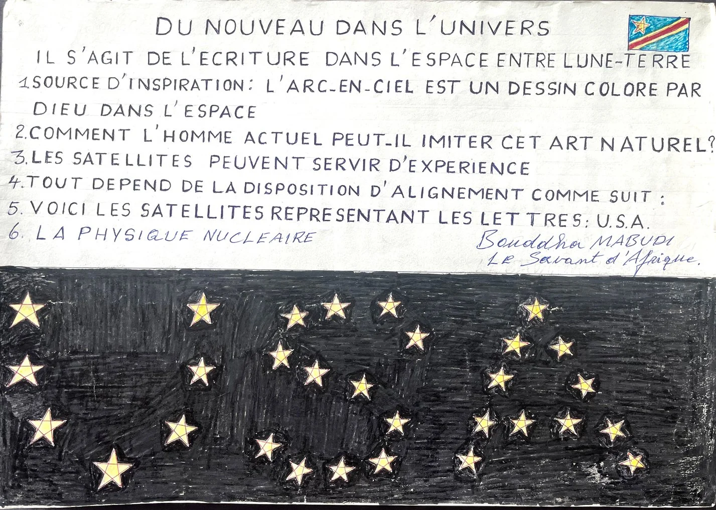 African, Self-Taught, artist, Bouddha Mabudi, was born into the Kuba tribe, on March 3, 1963, in Mweka, Democratic Republic of Congo. He lives in Kinshasa. His autobiography - L’INVENTION SUR LA CONSTRUCTION ALPHABETIQUE - chronicles his transition from hotel and food store manager to artist-inventor.